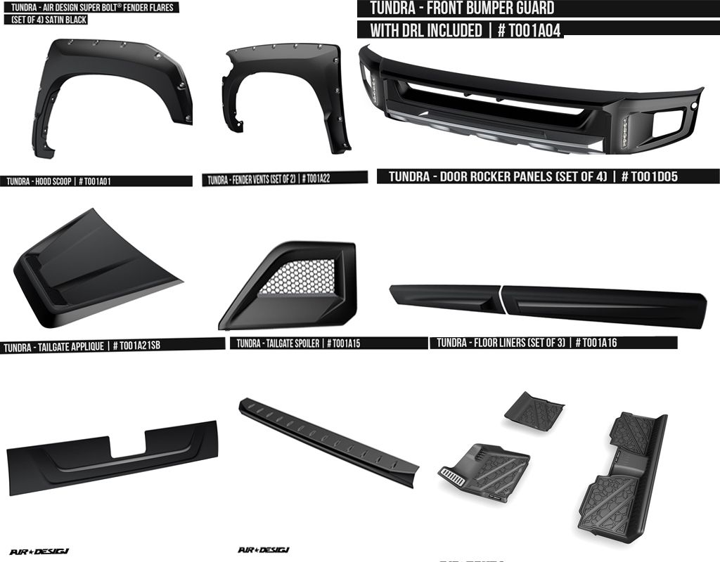 You don’t need a brand-new truck in order to customize it to suit your taste! Think about all the customizing potential your Tundra would have if you got to know Air Design. From Super Bolt Fender Flares to Rocker Panels, Front Bumper Guards, Hood Scoops, Tailgate trims and more. Air Design has your customizing needs covered from the front end to the rear!