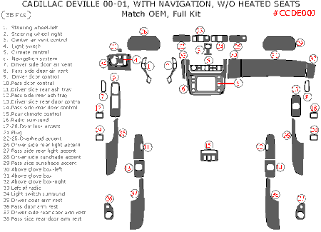 Fits 2000 2001 Cadillac Deville DTS XD DHS & Standard with Navigation System and without Heated Seats, add style to the interior of your vehicle with this FULL Dash Trim Kit w/ Navigation w/o Heated Seats, 38 Pcs, OEM Match. Simple peel and stick application makes this auto accessory a quick upgrade. Use to cover any damaged trims on your vehicle or simply to upgrade your car. Depending on selection, the kit is made from real and synthetic wood and carbon fiber and has ultra clear coat polyurethane for extra protection. You simply have to clean your vehicle's dashboard. Remove protected tape from the back of trim. Press the pieces onto your vehicle's dashboard. All our dash kits have 3M adhesive foam tape backing. | |||