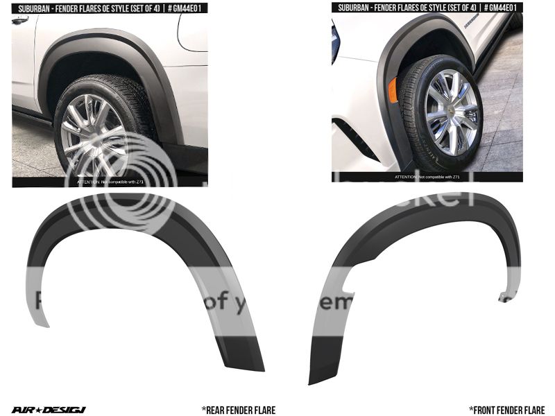Upgrade your ride and give it a sleek, custom look with our OE Style Fender Flares for the 2021-2023 Chevrolet Suburban. Made with top-quality materials and designed to perfectly fit your vehicle, our fender flares will not only enhance its appearance but also protect it from road debris, mud, and dust. Whether you're driving on the highway or off-road, our fender flares will keep your vehicle looking great and prevent any damage. Don't let your Suburban blend in with the crowd - stand out with our stylish and functional fender flares. Order now and get ready to hit the road in style!