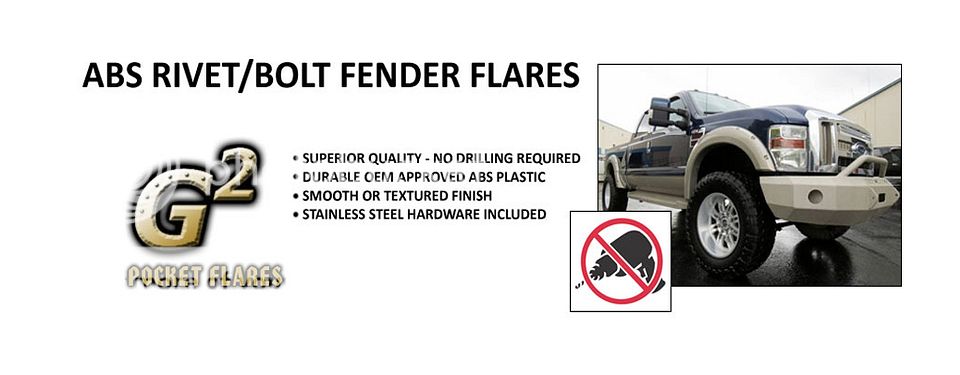 The G2 series flares are designed to give great styling to your truck while adding extra clearance for wider tires. Works as an extra barrier against road debris from flying up and damaging fenders and doors. All flares come in your choice of a textured or smooth finish and are made from 100% ABS composite for extended life expectancy and installed using a no-drill design. Each set of G2 Pocket flares comes with a limited lifetime manufacturer warranty