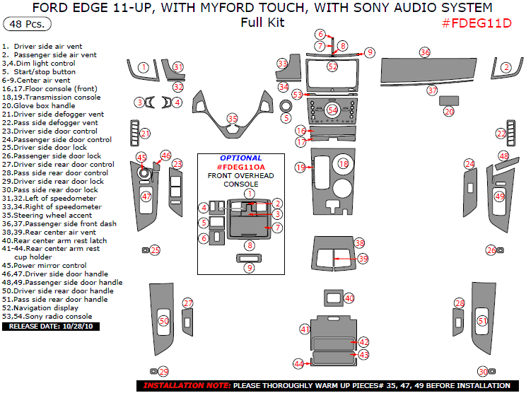2011 Ford Edge w/ MyFord Touch, w/ Sony Audio System, Interior Full Dash Trim Kit, 48 Pcs